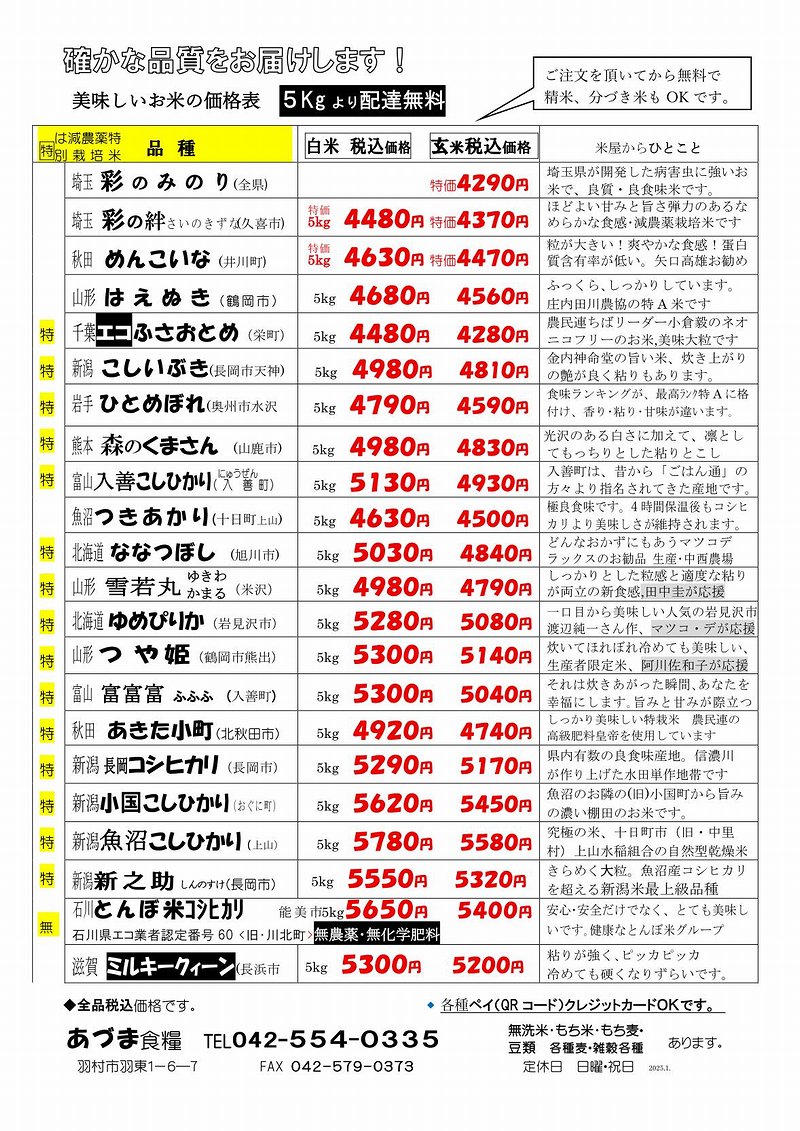 質と味にこだわる米屋、東京羽村 お米の店[あづま食糧]です。全国の農家仲間と交流を重ね、産地直送の美味しくて健康なお米を、店頭精米によりお得な価格で販売しています。精米度やブレンドなどお客様のご希望に対応します。市内を中心に配達も承っております。